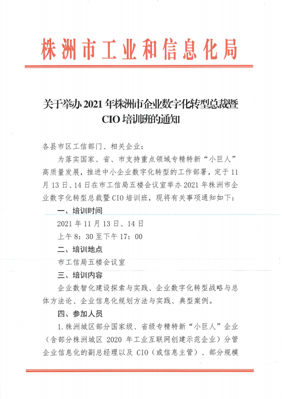 關(guān)于舉辦2021年株洲市企業(yè)數(shù)字化轉(zhuǎn)型總裁暨CIO培訓(xùn)班的通知